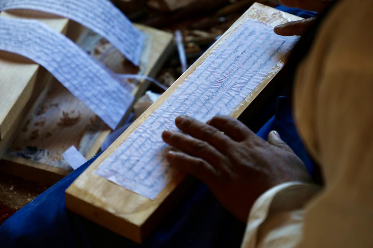 写有藏文书法的白纸正面贴在雕版上。人民网次仁罗布摄