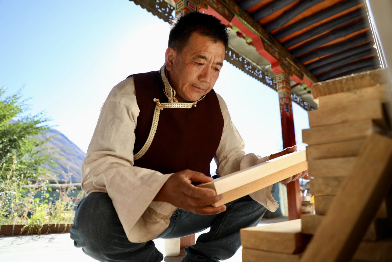 嘎玛曲扎正在挑选雕刻所用木板。人民网次仁罗布摄