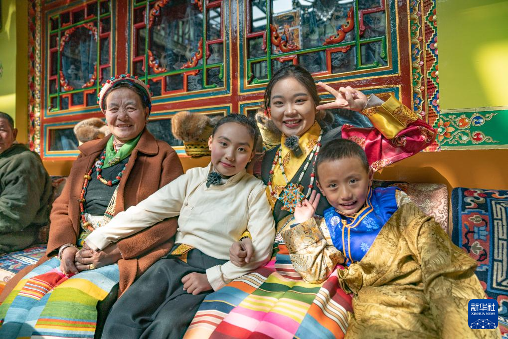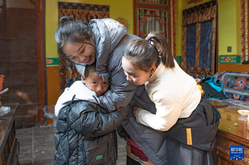 后来我们又去莫拉家拍摄了团圆饭、换新藏装等场景。拍摄时,我需要穿藏装和巴桑莫拉的女儿进行互动,而当天日喀则的气温已经到了零下,她发现我的双手冰凉后,全程都用自己的手捂着我的手,想让我暖和一点。拍摄结束以后,小朋友们也围在我身边抱着我,想用自己的方式给我传递一点温暖。