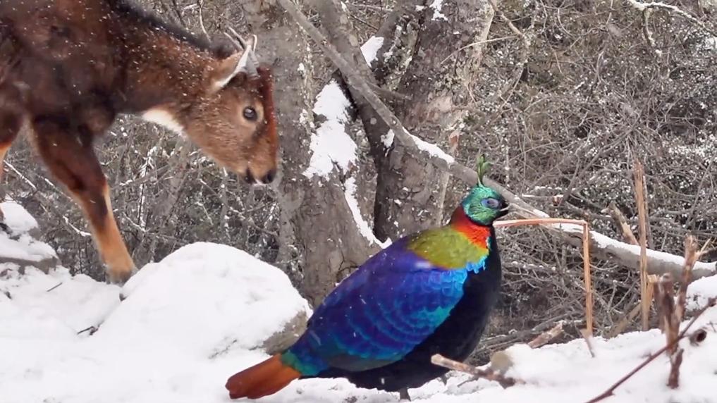 近日,“新春走基层”记者在中国与不丹交界的西藏洛扎县拉康镇,拍到了喜马拉雅斑羚和棕尾虹雉两种珍稀野生动物同框的画面。喜马拉雅斑羚和棕尾虹雉均是国家一级保护动物。