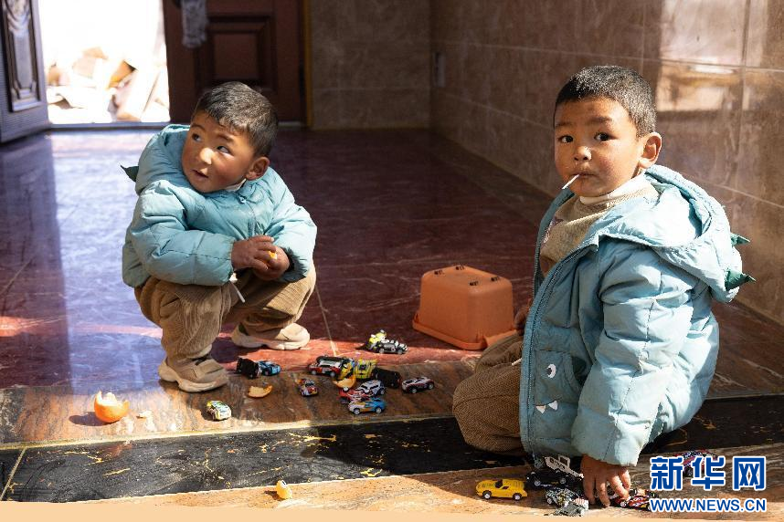 图为贡嘎的孙子们在光洁的地面上玩耍(1月29日摄)。新华网发 李腾 摄