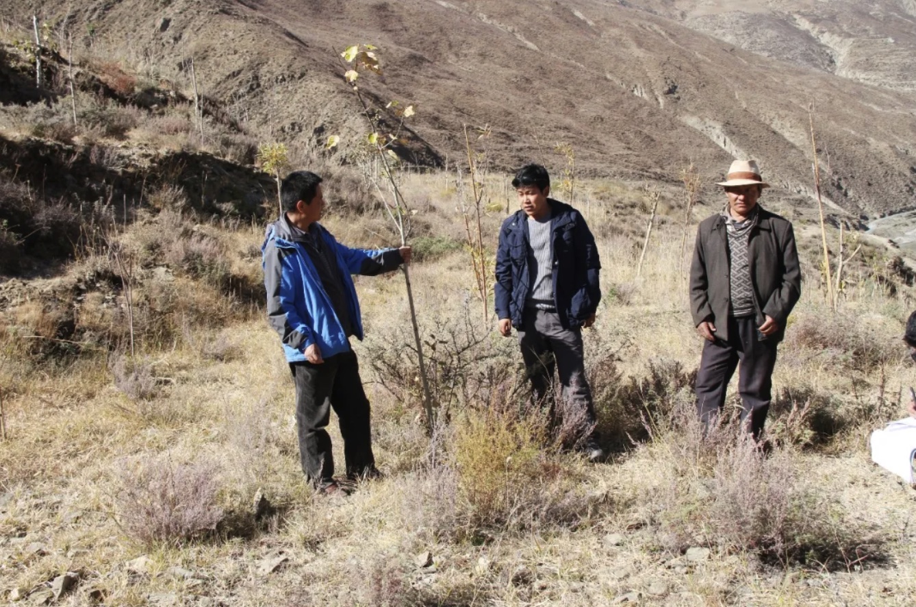图为尼玛次仁(左一)查看树苗生长情况。(图片由受访者本人提供)