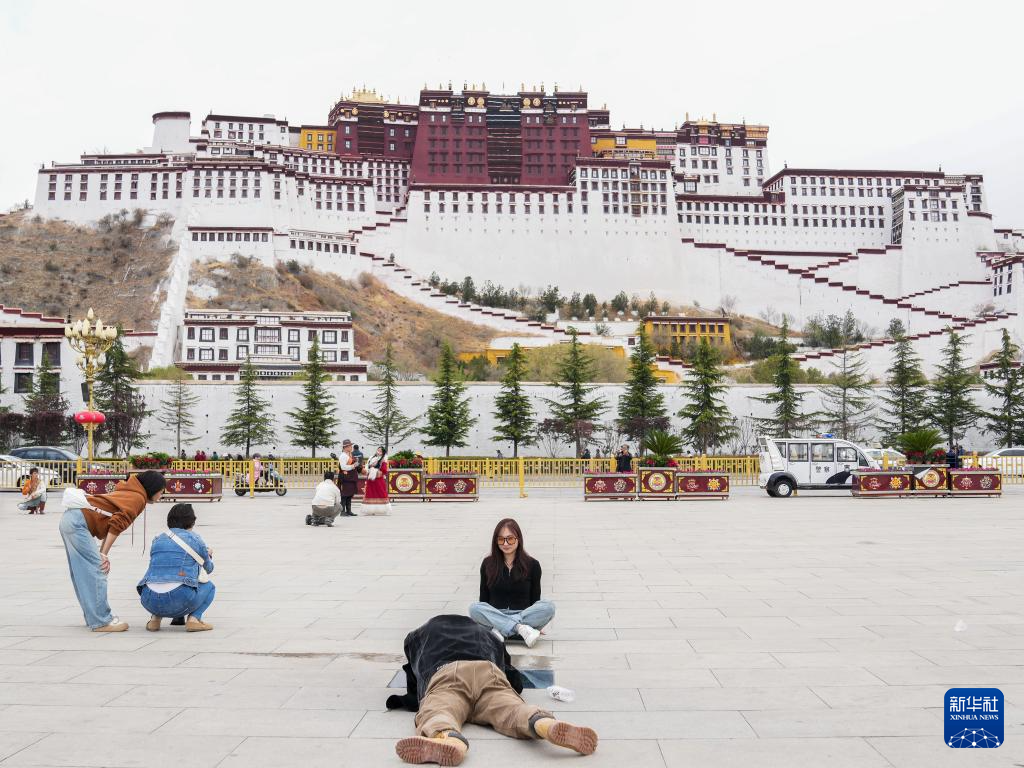 5月5日,游客在布达拉宫广场拍照留念。新华社记者 丁汀 摄