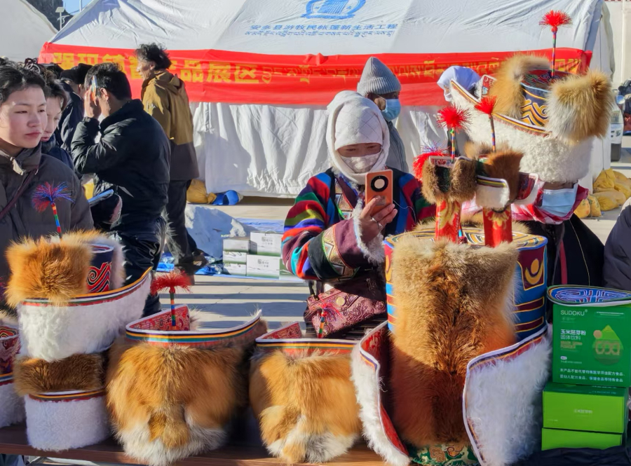 一大早,安多县民族团结广场上人潮涌动、热闹非凡,琳琅满目的商品让人目不暇接,人们穿梭在各摊位间,选购着自己心仪的物品。“这个最小的100元,稍大点的150元……”销售安多“天线帽”的展位,受到不少顾客的关注和青睐。安多“天线帽”是国家级非物质文化遗产,成为当地一种独特的文化符号。结合文创市场需求,安多县开发迷你版的安多“天线帽”,既浓缩了传统手工艺品的精髓,又可以用来当摆件,极具收藏价值。