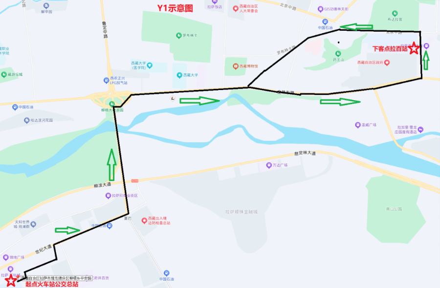 Y1线路全长15.2公里,经过路段:通站路—北京大道—世纪大道—柳梧大桥—金珠东路—康昂多南路—北京中路—林廓西路—罗布林卡路—金珠西路—柳梧大桥—世纪大道—北京大道—通站路。