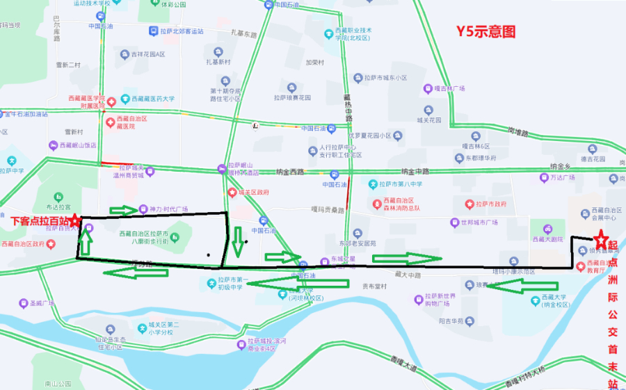Y5线路全长15公里,经过路段:塔玛东路—藏大东路—江苏西路—康昂多南路—北京东路—林廓东路中段—江苏东路—藏大东路—塔玛东路。