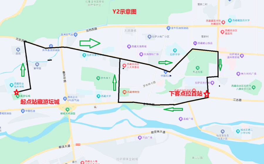Y2线路全长16.2公里,经过路段:罗堆西路—八一北路—北京西路—林廓西路—林廓北路—娘热南路—北京中路—康昂多南路—金珠西路—民族中路—北京西路—八一北路—罗堆西路。
