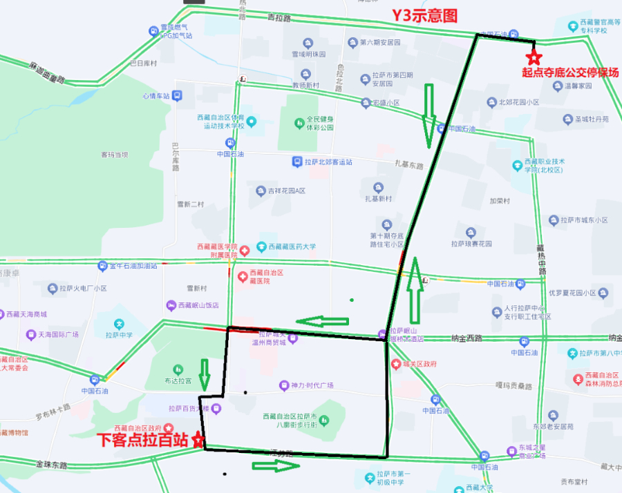 Y3线路全长13.8公里,经过路段:吉拉路—夺底路北段—夺底南路—林廓西路—娘热南路—北京中路—康昂多南路—江苏路—林廓东路中段—夺底北路段—吉拉路。