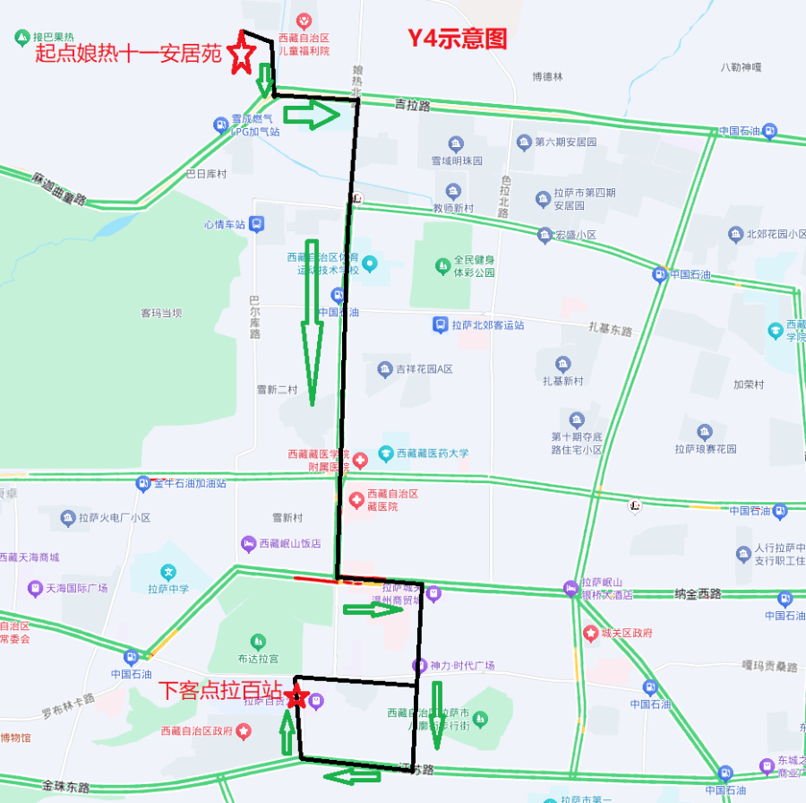 Y4线路全长17公里,经过路段:娘热十一安居苑—吉拉路—娘热南路—康昂多南路—金珠西路—德吉北路—北京中路—娘热北路—吉拉路—娘热十一安居苑。
