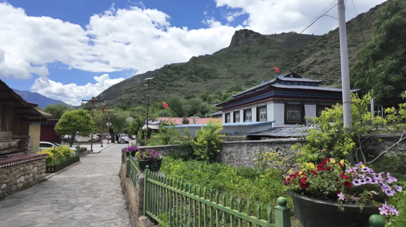 “犬吠水声中,桃花带露浓。”坐在鲜花绽放的美丽庭院内,嘎拉村村民白玛德庆和丈夫旦增尼玛的脸上洋溢着喜悦。