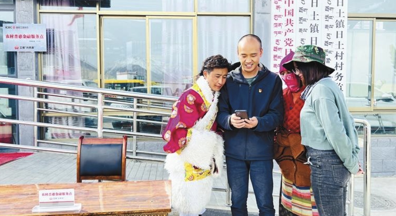 工行西藏分行驻村队员为当地村民介绍“兴农通”APP金融服务功能及使用方法。