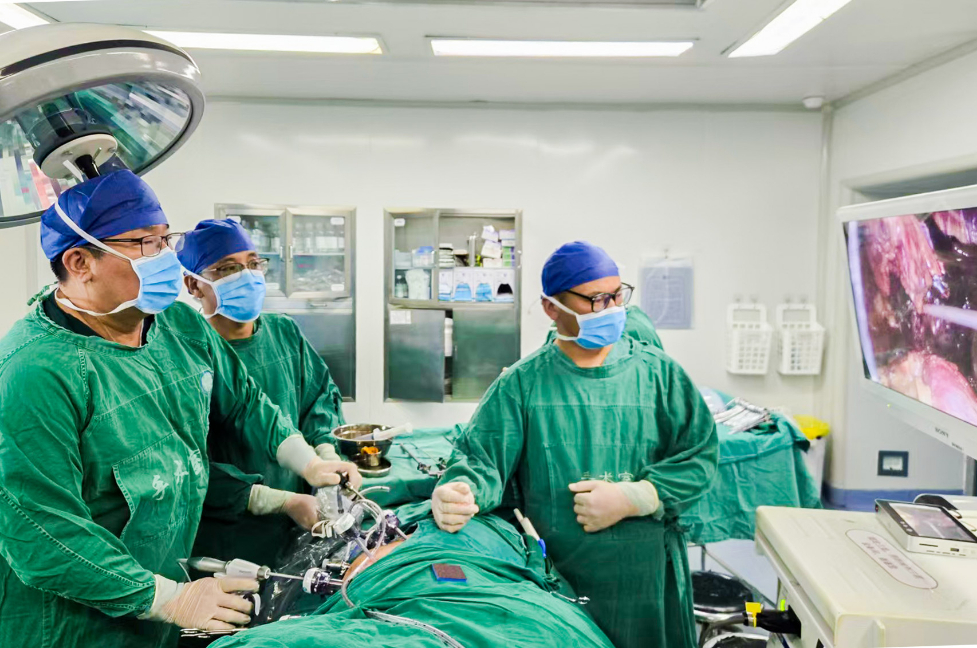 张宝鹏和斯朗江村通力配合,全神贯注地操作着腹腔镜器械,“超声刀准备,逐步分离肿瘤包膜”。