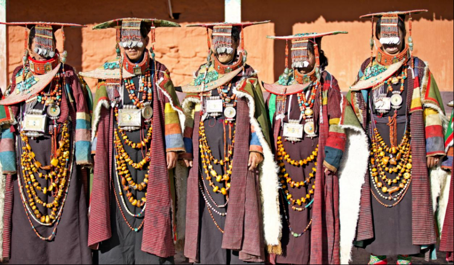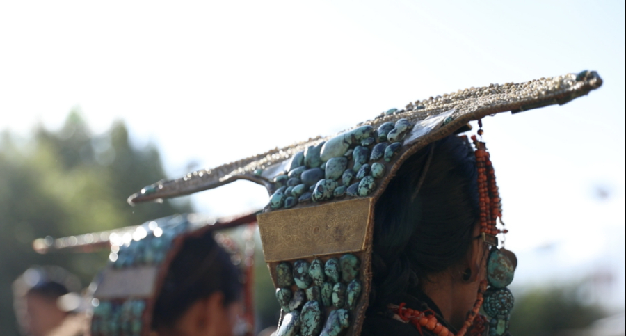 这套仅在节日盛典穿戴的服饰可谓“世代家产集于一身”。从头到脚装饰着黄金、白银、松石、玛瑙、珊瑚、珍珠、田黄等珍贵材料,重达二十多公斤。袍子是纯羊毛经过纺线、染色、编制而成,披风由羊羔皮和丝绸缝制,靴底采用牦牛皮和牦牛毛,上面绣有精美手工图案。