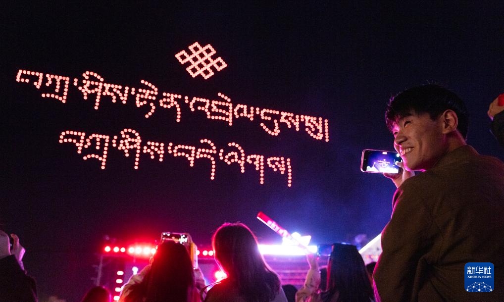 这是百威拉萨音乐嘉年华现场的无人机表演,藏语大意为“吉祥时刻,扎西德勒”(9月29日摄)。新华社记者 丁增尼达 摄