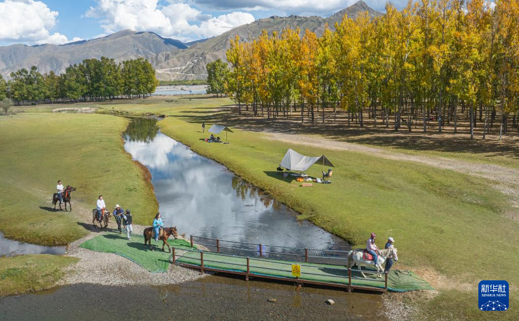 游客们在拉萨市林周县“神秘树林”林卡营地体验骑马(9月27日摄,无人机照片)。新华社记者 丁增尼达 摄