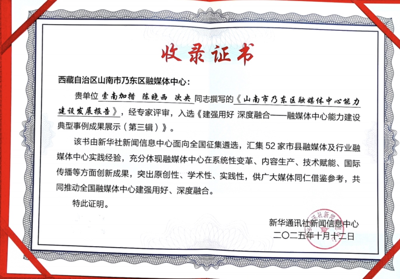 图为山南市乃东区融媒体中心的收录证书。