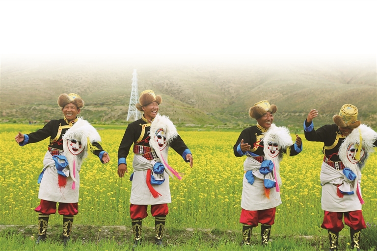 农牧民在油菜花田中欢快舞蹈。