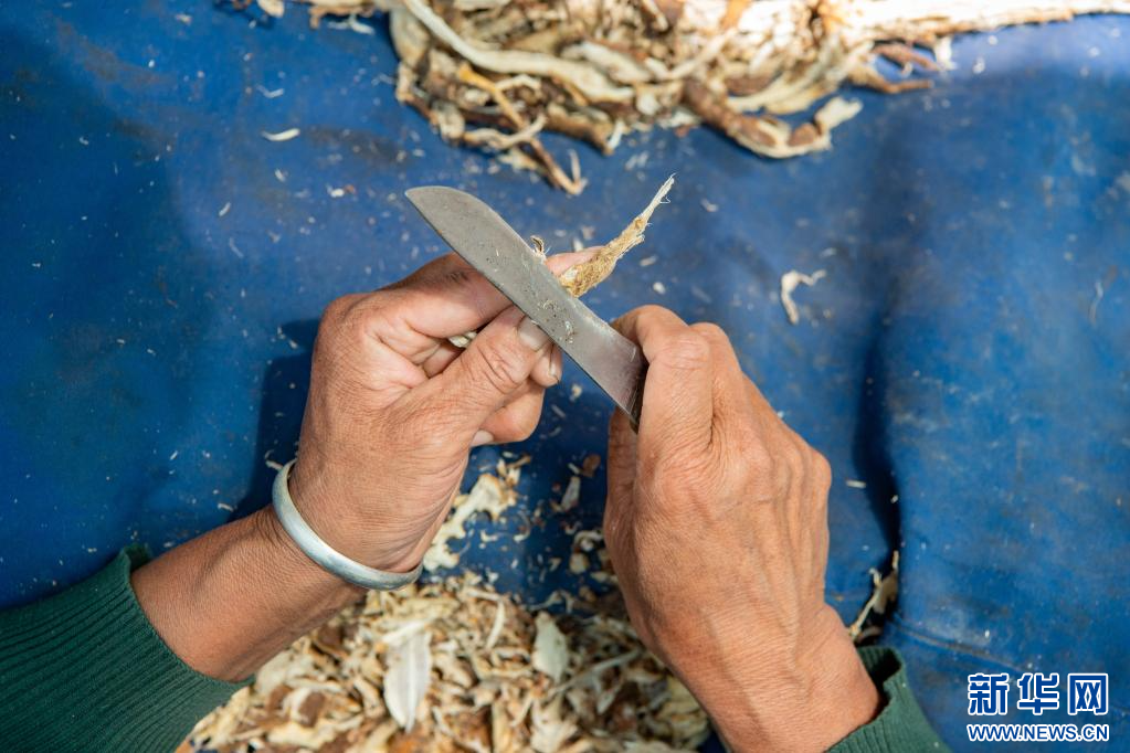 10月16日,合作社员工为藏纸原料狼毒草根去皮。新华网 旦增努布 摄