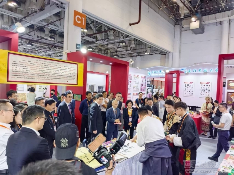 扎西曲吉参加福建省厦门市第十六届海峡两岸(厦门)文化产业博览交易会现场书写“团结统一”的汉藏双语书法作品并作讲解