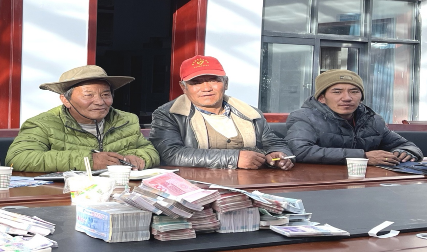 图为公司为参与“半舍饲养”的农牧民群众发放现金。(受访者供图)