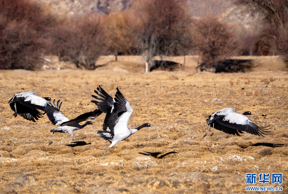 这是11月26日在西藏拉萨市林周县境内拍摄的黑颈鹤。新华网 旦增努布 摄