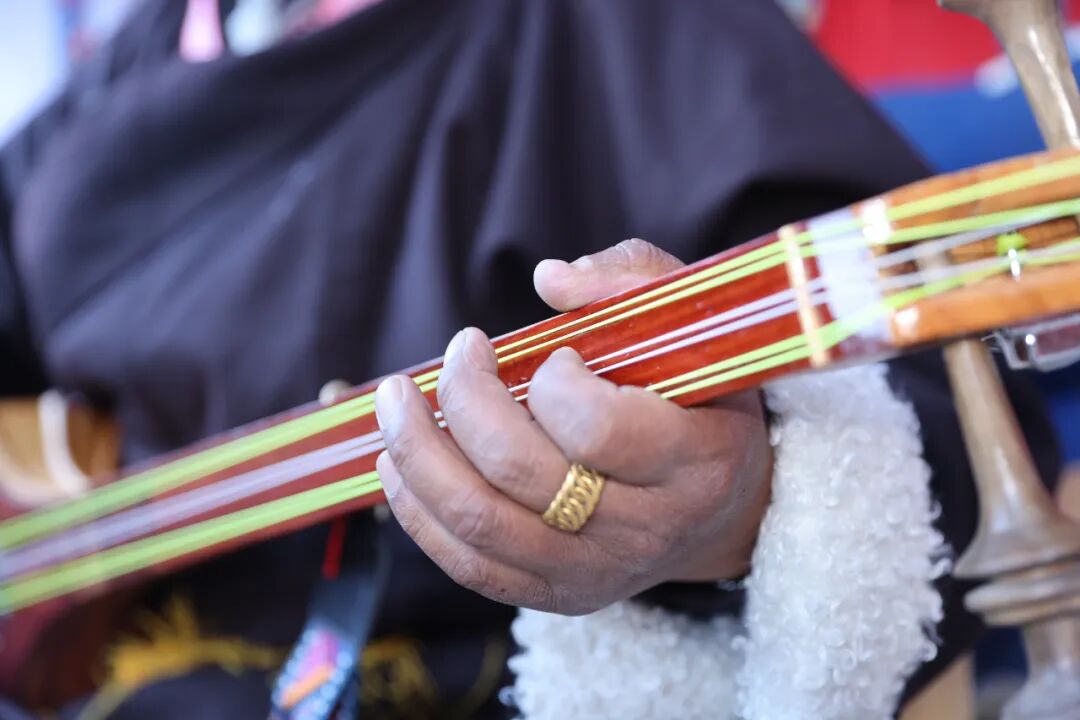 在第45届雅砻物资交流会非遗展区的喧嚷声里,手工艺人洛桑曲扎正怀抱一把自制的扎木念琴,手指在琴弦上熟练地弹拨,哼唱着古老的歌谣。这双正撩动琴弦的手,指节粗大,布满经年累月与木材、刻刀打交道留下的硬茧与细痕,此刻却异常灵巧。