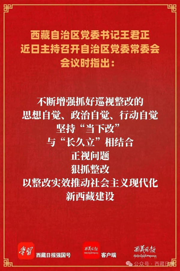 王君正强调,主动认识问题是一种清醒,敢于正视问题是一种自信,能够解决问题是一种能力。要对标对表党中央部署要求,坚持问题导向,突出重点关键,健全制度、补齐短板、堵塞漏洞,进一步增强整改针对性实效性,以钉钉子精神推动巡视整改取得实效。强化政治引领抓整改,胸怀“国之大者”,以真改实改的政治担当抓好巡视整改,深入查找各领域存在的机制性、制度性漏洞,形成针对性系统性解决方案,以巡促改、以巡促建、以巡促治,发挥巡视标本兼治的战略作用。紧扣中心任务抓整改,把巡视整改与学习贯彻党的二十届四中全会精神结合起来,与学习贯彻习近平总书记关于西藏工作的重要指示和新时代党的治藏方略结合起来,与学习贯彻习近平总书记视察西藏时的重要讲话精神结合起来,按照自治区党委十届九次全会工作安排,扎实推动稳定、发展、生态、强边四件大事落实。站稳人民立场抓整改,牢固树立正确政绩观和“过紧日子”的思想,自觉站在群众立场上观察、分析和思考问题,改善民生、凝聚人心,带着感情办好群众关心的事情,努力做到决策科学民主、执行坚决有力、办事合法高效,不断增强各族群众的获得感幸福感安全感。坚持自我革命抓整改,把巡视整改作为全面从严治党、净化政治生态、加强领导班子建设的重要抓手,压紧压实管党治党政治责任,巩固拓展深入贯彻中央八项规定精神学习教育成果,进一步改进作风狠抓落实,以刀刃向内的勇气、动真碰硬的决心下大力气解决顽瘴痼疾,以严深细实的工作作风保障整改取得实效,不断把全面从严治党引向深入。