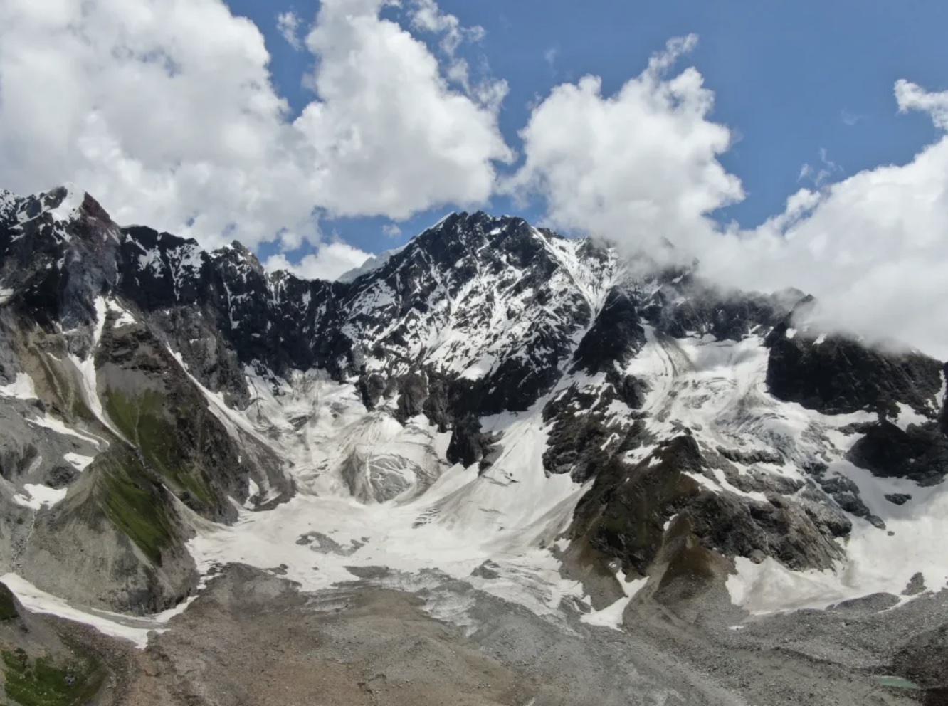 站在山脚处仰望,绿色植被渐渐消失,苍灰色的岩壁裸露出来,云雾中的山顶终年被白雪覆盖。