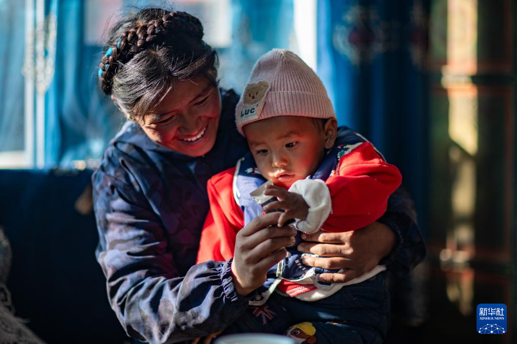 1月5日,在西藏定日县长所乡杂村,母亲朋琼在家中逗弄次仁拉巴。新华社记者 姜帆 摄