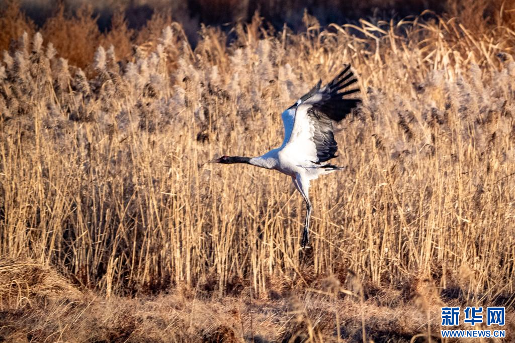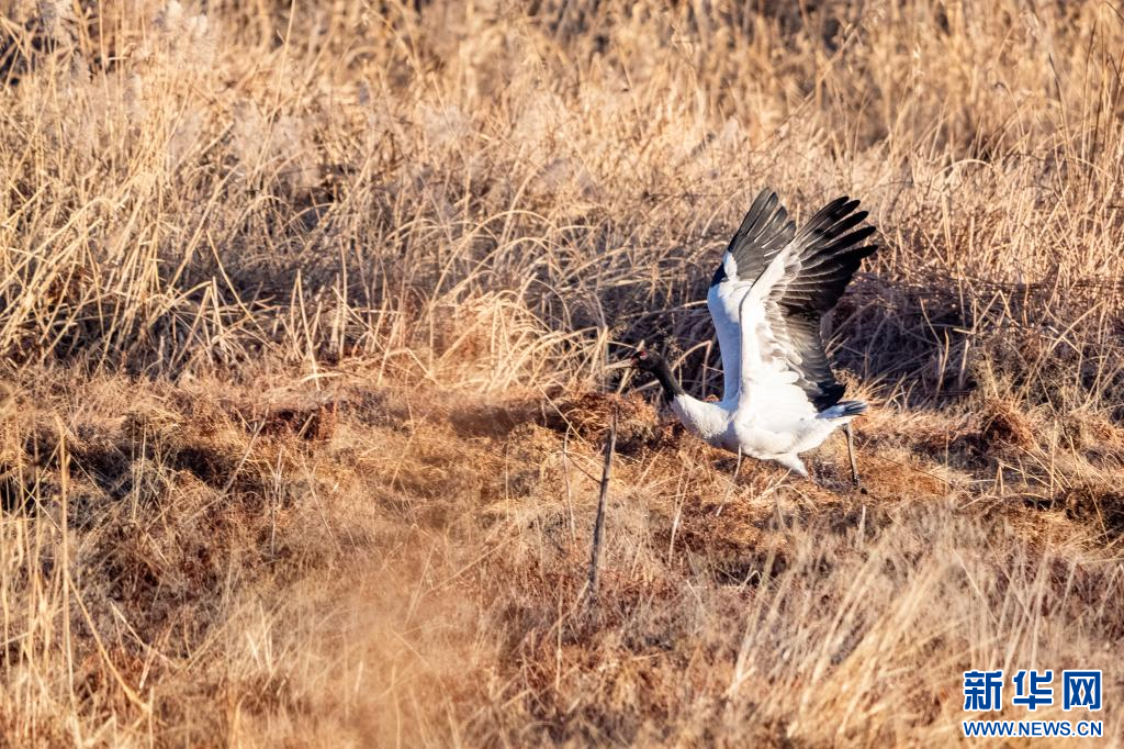 1月10日,在拉萨市拉鲁湿地拍摄的黑颈鹤。新华网 旦增努布 摄