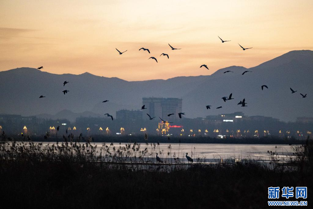 1月9日,傍晚时刻在拉萨市拉鲁湿地越冬的黑颈鹤和候鸟。新华网 旦增努布 摄