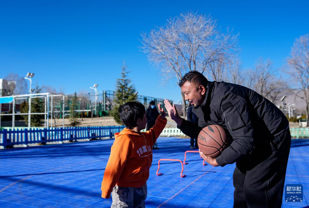1月22日,在拉萨市全民健身体彩公园,“阳光残障儿童公益兴趣班”教师土旦格桑(右)在体适能训练课程间隙与一名残障儿童击掌。新华社记者 丁增尼达 摄