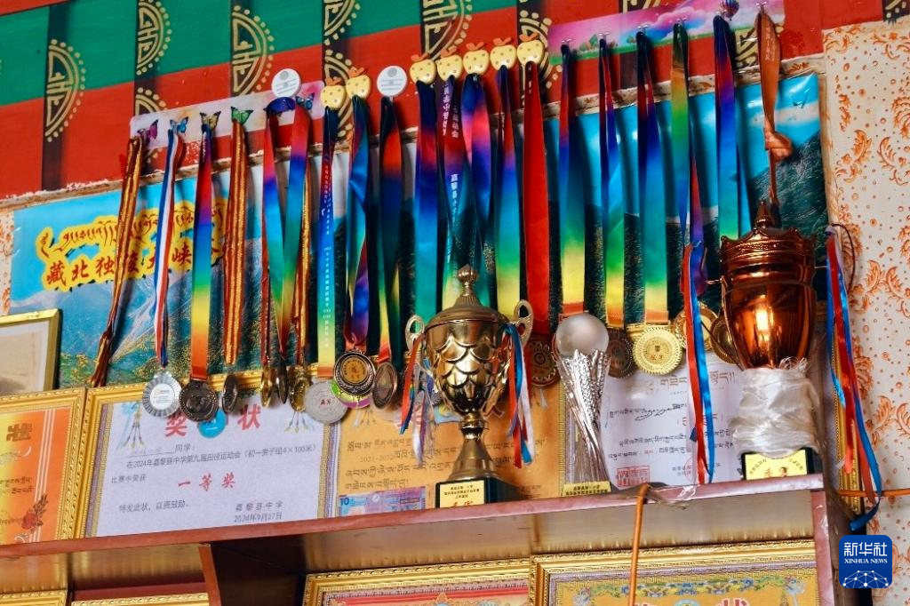 如今,顿珠嘉措家里的柜子上摆满了他和哥哥获得的奖杯和奖牌,哥哥被选入那曲市青少年满天星训练营,有更多的机会到外面开拓眼界、学习提升,也成为了顿珠嘉措的榜样。正在上初二的他,也有了自己的目标,希望能考上区外的大学,当一名体育老师,服务家乡。