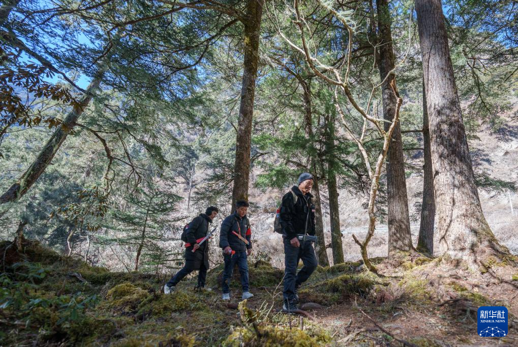 在西藏山南市隆子县玉麦乡境内,护边员们在丛林里巡逻(2月6日摄)。午饭过后,护边员们从雪线一路往下继续巡逻,海拔越来越低,树林也越来越密。茂密的藤蔓灌木有时会把人完全遮住。护边员们抽出腰间砍刀,一刀刀劈开拦路枝杈,踏出一条小径。新华社记者 丁增尼达 摄
