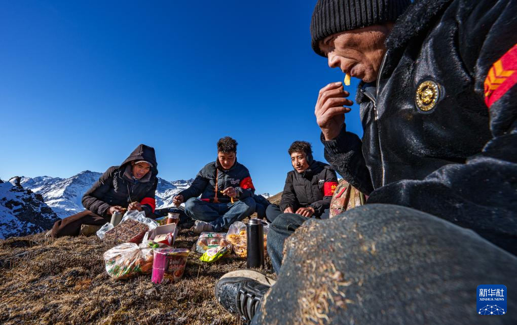 2月6日,在西藏山南市隆子县玉麦乡境内,护边员们在巡逻途中吃午饭。他们围坐在一片平坦草地,从背包里掏出糌粑、卡塞(一种传统油炸面食),再喝几口酥油茶,这就是巡逻护边途中一顿简单的午餐。新华社记者 丁增尼达 摄