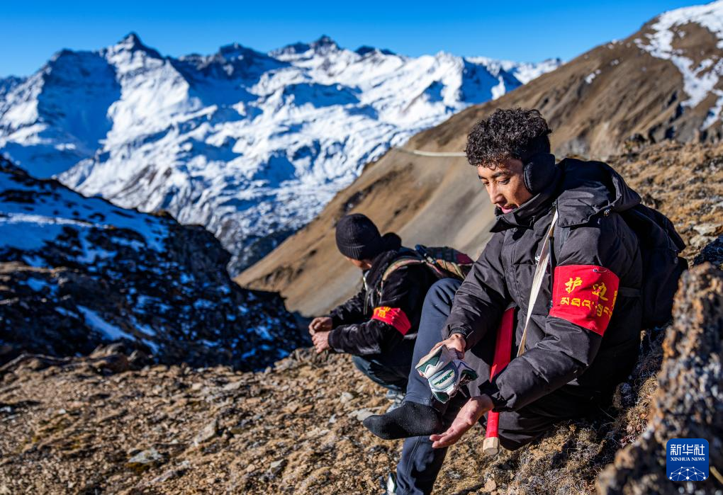 在西藏山南市隆子县玉麦乡境内,护边员拉巴次仁(右)在清理灌进鞋里的沙石和积雪(2月6日摄)。新华社记者 丁增尼达 摄