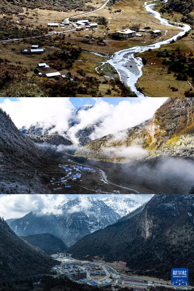 拼版照片:上图是2003年10月26日拍摄的玉麦乡(新华社记者 索朗罗布 摄);中图是2017年10月31日拍摄的玉麦乡(新华社记者 普布扎西 摄);下图是2026年2月5日拍摄的玉麦乡(无人机照片,新华社记者 丁增尼达 摄)。