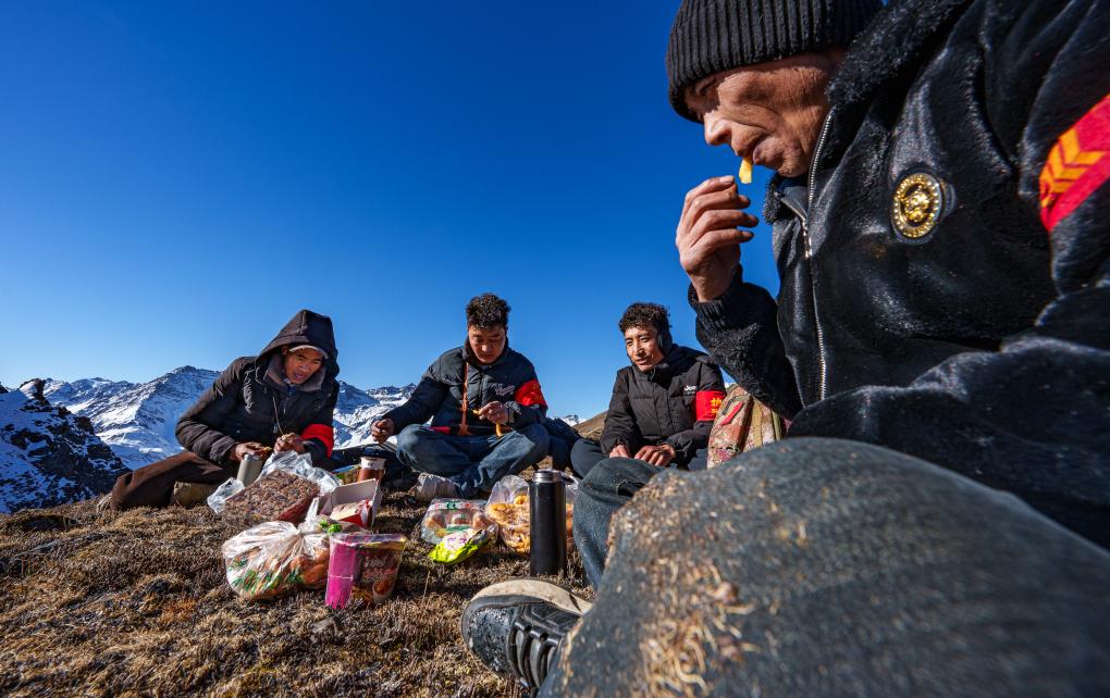在西藏山南市隆子县玉麦乡境内,护边员们在巡逻途中吃午饭。新华社记者 丁增尼达 摄