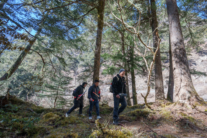 在西藏山南市隆子县玉麦乡境内,护边员们在丛林里巡逻。新华社记者 丁增尼达 摄