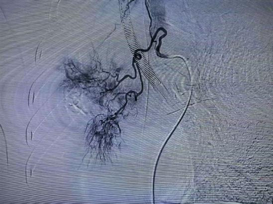 介入科主任雷彦明团队迅速就位,目标是从源头 “堵住” 出血点。在患者氧合尚未完全稳定的情况下,团队通过血管造影迅速定位出血责任血管,随后精准实施支气管动脉栓塞术,用栓塞剂将出血血管 “堵死”,从根源上止住了咯血。