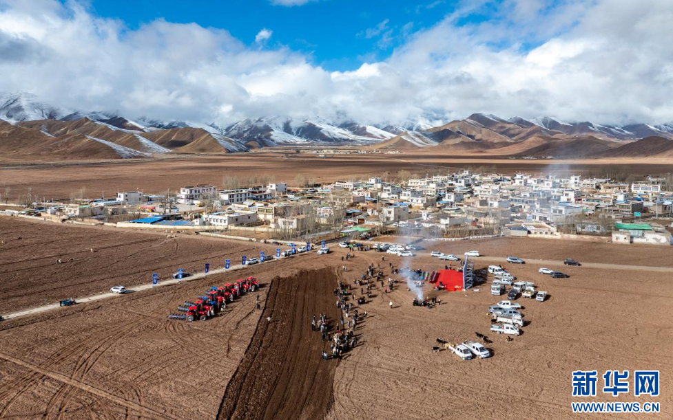 图为西藏拉萨市林周县春堆乡春堆村的春耕仪式现场( 3月16日摄 无人机照片)。新华网 旦增努布 摄
