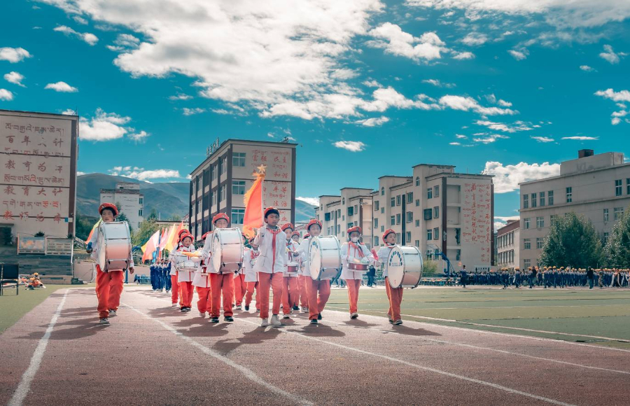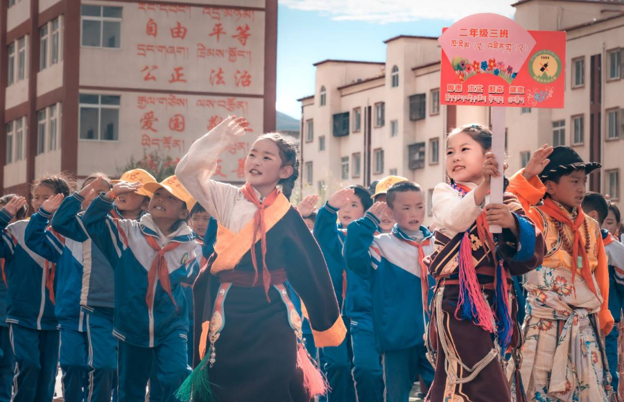 藏装与校服的叠影、标语与笑靥的交融,把高原校园的热闹与温柔织在一起,把校园里的朝气写成高原上鲜活的诗。(图片于2023年9月27日拍摄 泽旺曲培)