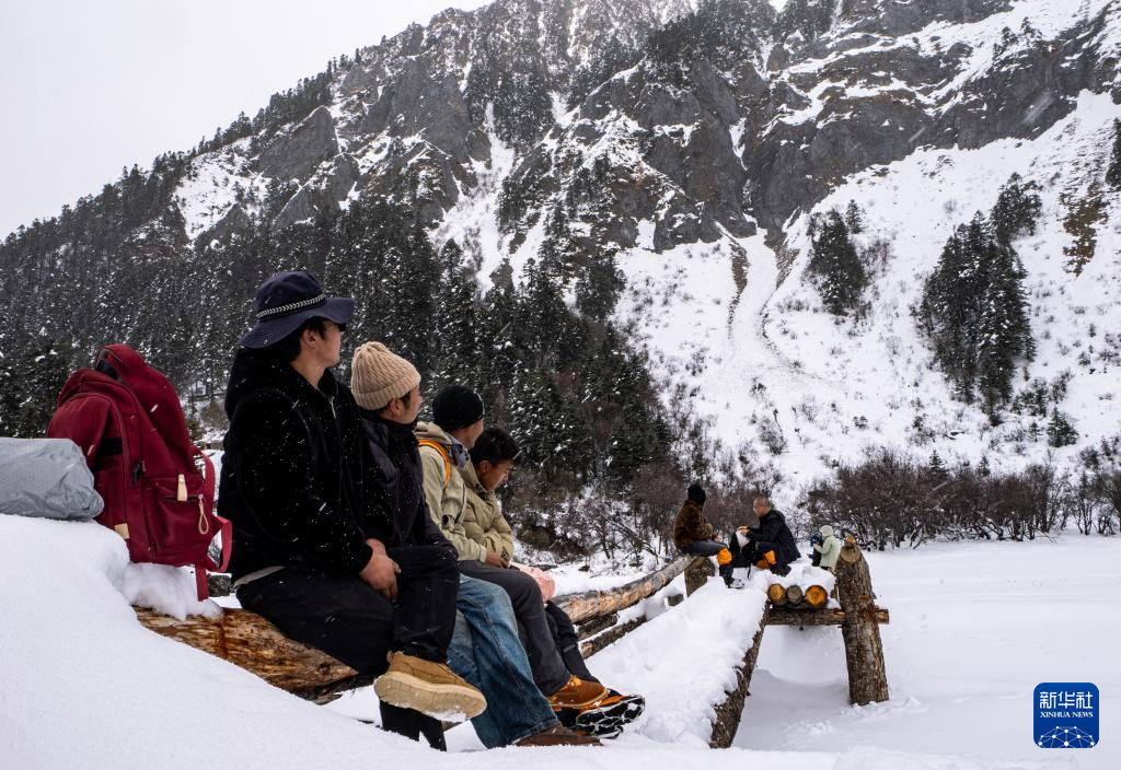3月21日,当地向导和游人一起在白普隆沟牧场的木桥上休息。新华社记者 普布次仁 摄
