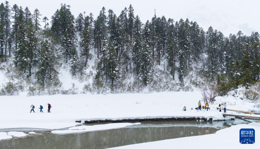 游人在白普隆沟牧场感受雪景(3月21日摄,无人机照片)。新华社记者 普布次仁 摄