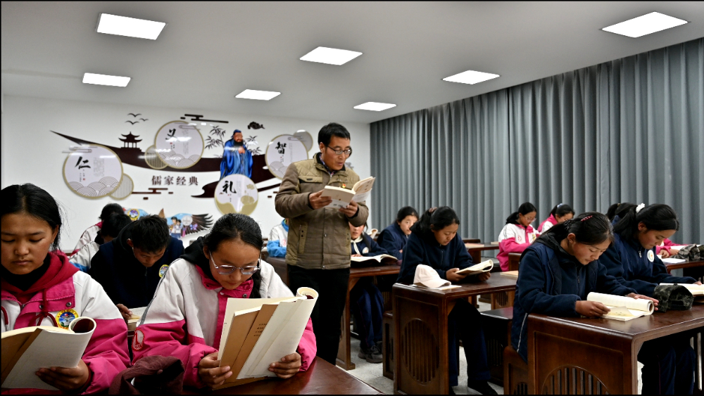 西藏日喀则市南木林县第二中学孔子学堂内师生们诵读经典。新华网发 刘蒙青 摄