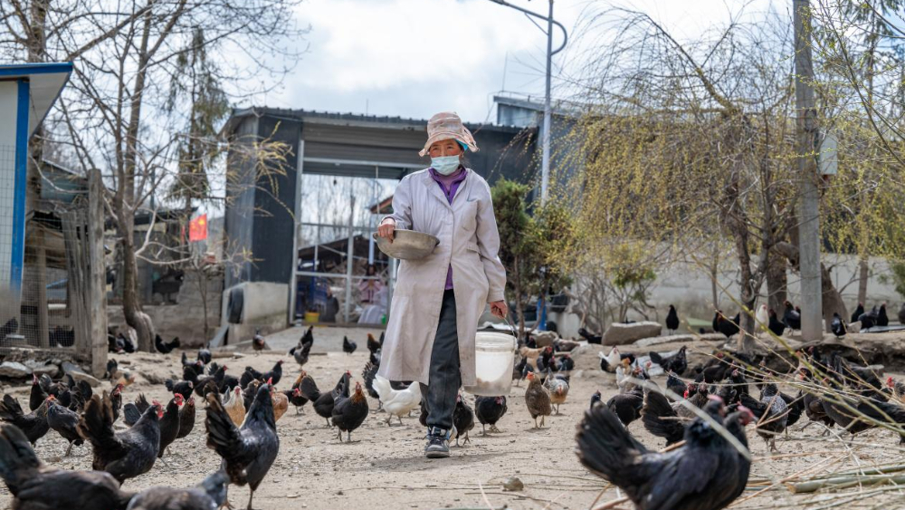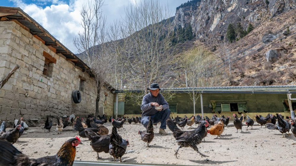 3月26日,西藏日喀则市亚东县如丙岗村罗旦土鸡养殖专业合作社负责人次仁罗旦在喂养藏鸡。新华网 旦增努布 摄