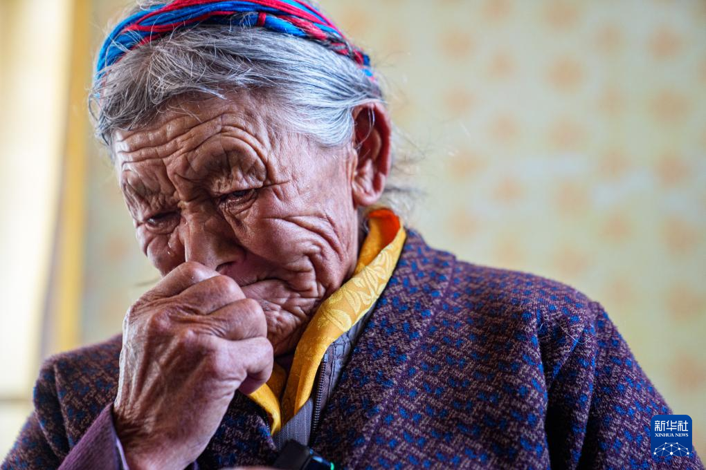 次仁桑姆和家人在宗卡村家中回忆曾经的生活,黯然泪下(3月26日摄)。