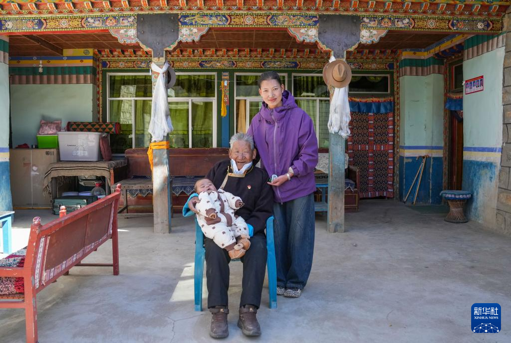 次仁桑珠(中)和孙女、曾孙在西藏山南市扎囊县桑耶镇家中的合影(3月25日摄)。