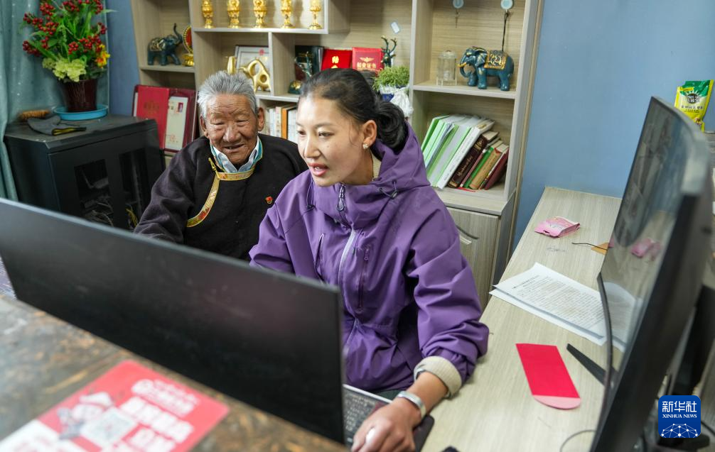 次仁桑珠(左)和孙女在查看酒店入住情况(3月25日摄)。