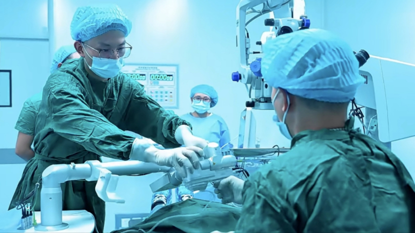 图为医护人员使用超清全飞激光设备开展手术。